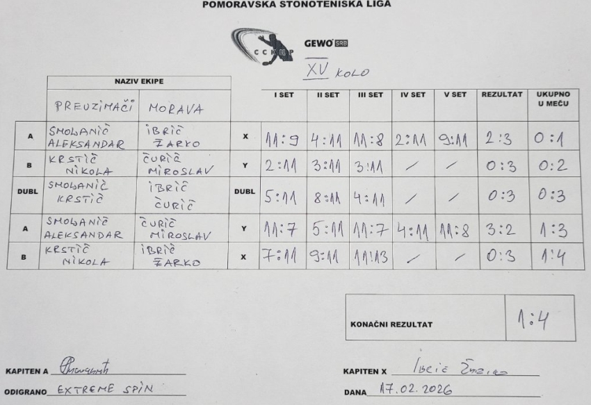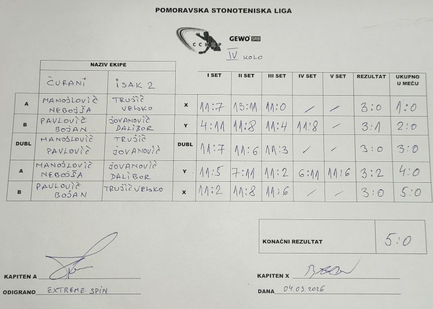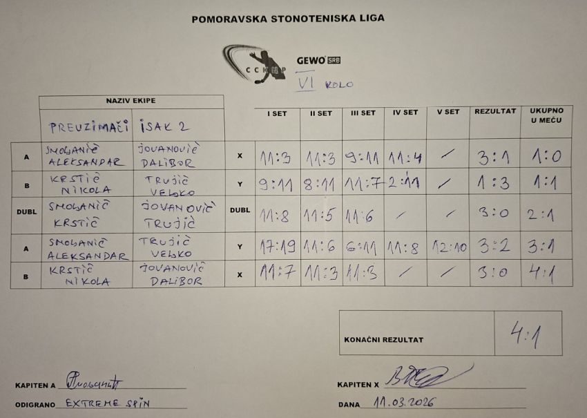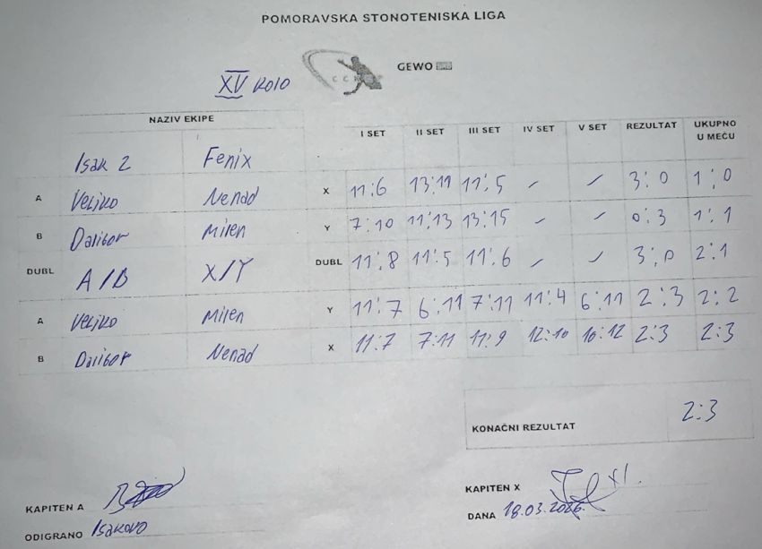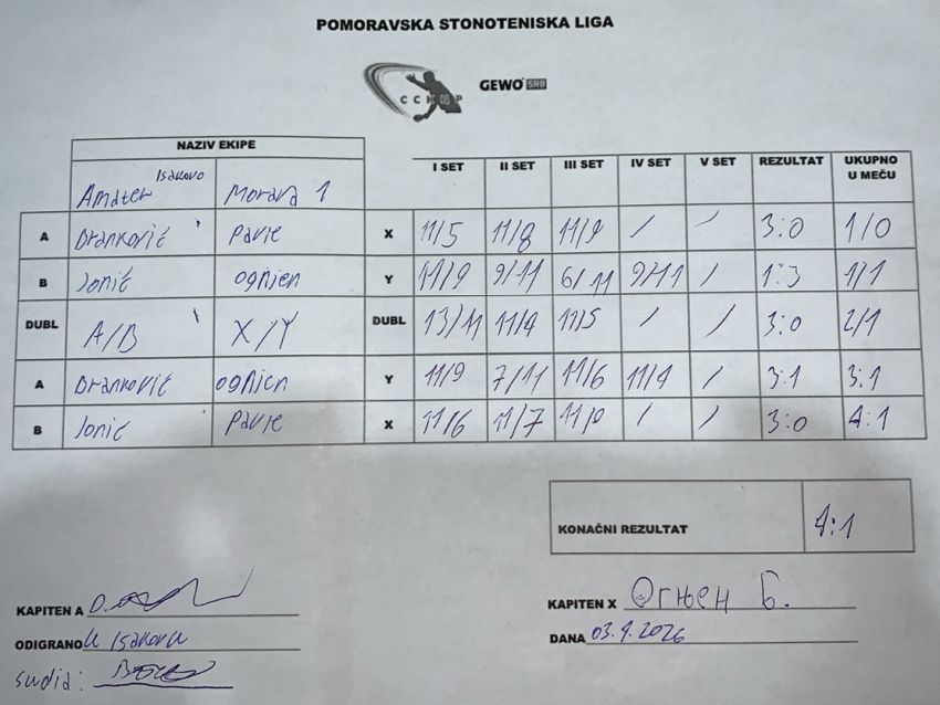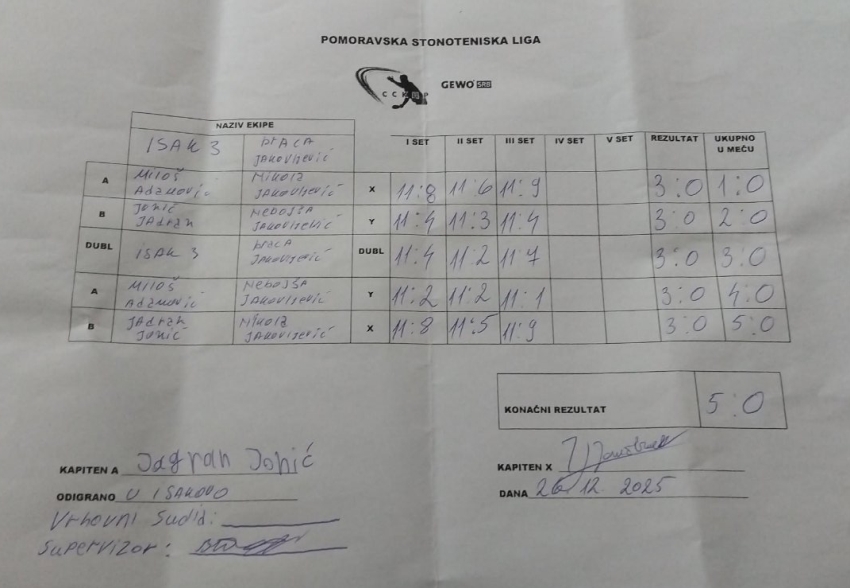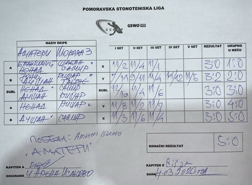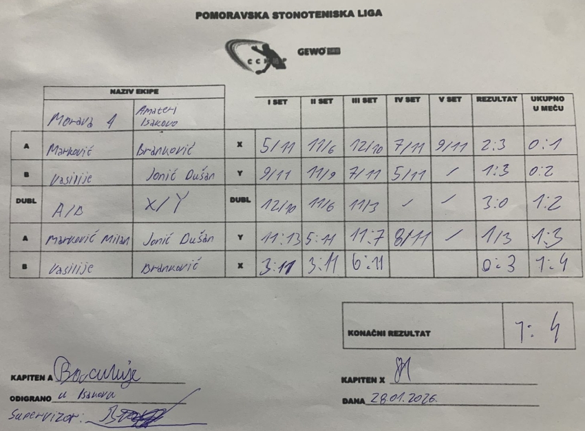 | STK "Amateri iz Isakova" (5) | STK “Morava 1” (0) | BILTEN |