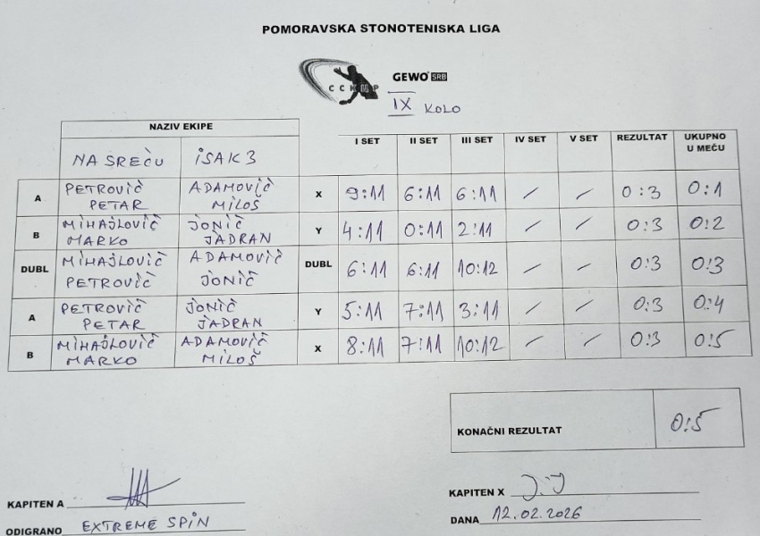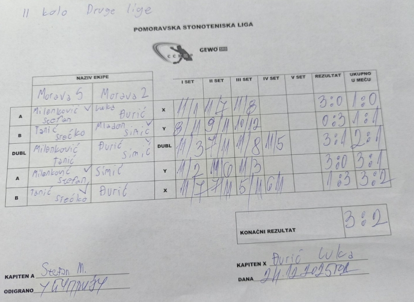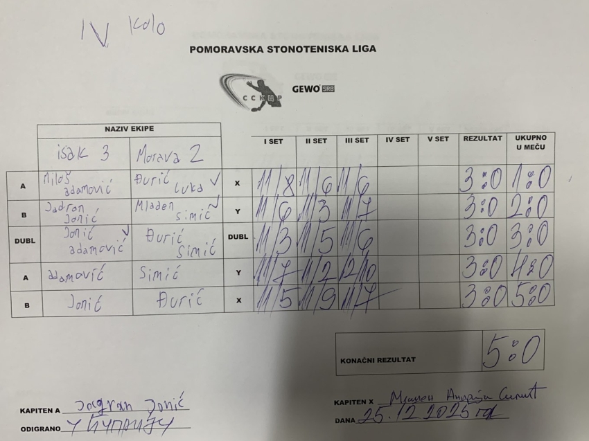 | STK “Isak” (5) | STK “Morava 2” (0) | BILTEN |