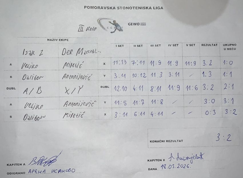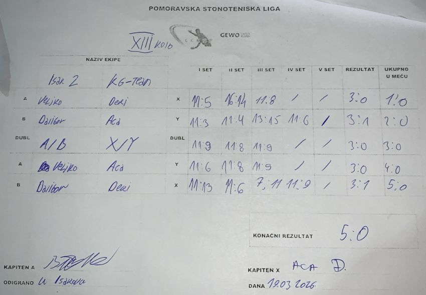 | STK “Morava” (5) | STK “Isak” (0) | BILTEN |